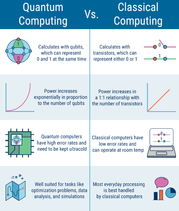 | 큐비트 기반. 0, 1 그리고 모든 조합 | 트랜지스터 기반. 0 또는 1 |