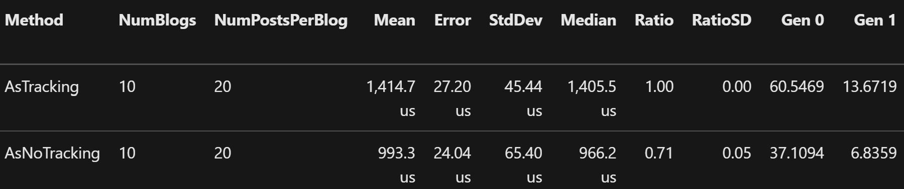 AsNoTracking() 이 들어가면 데이터를 수정할 수가 없다는 단점이 있지만 리스트에 보여주기만 하는 목적이면 아주 앱의 성능에 플러스 효과를 가져다주죠. 아래의 마이크로 소프트에서 보여주는 데이터를 보시면 50% 정도의 스피드 향상이 있습니다. 아주 중요한 팁이에요